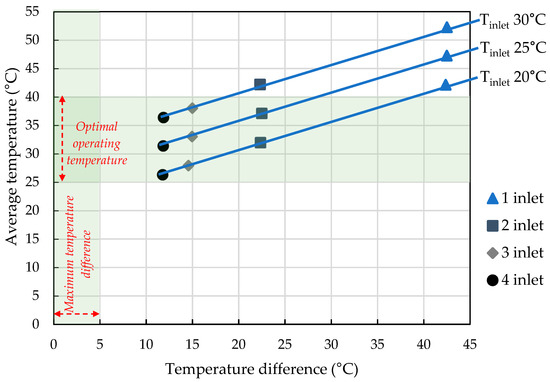 The simulation results of varying the inlet air temperature to each inlet configuration are presented in Figure 8 as a plot of temperature difference to the average temperature. It was fair to use average temperature as the representative parameter because one of the main objectives of the optimization was to obtain the lowest temperature difference that was still located within the optimal temperature range. The horizontal shaded area represents the optimal operating temperature, while the vertical one represents the optimal temperature difference for the lithium-ion battery, and the intersection between the two areas represents the optimal criteria for an optimized cooling strategy. From Figure 8, it can also be seen that for constant inlet air temperature, the temperature difference decreases as the number of inlets increases. The temperature difference was significantly affected by the number of inlets because higher inlet numbers had a wider inlet area that made it easier for air to reach every spot inside the battery pack.