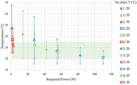 The power required and the resulting temperature of all cooling strategies are plotted in Figure 9. Each strategy is represented by a marker that indicates its required power in x axis, and average temperature in y axis. The marker shape represents the inlet number of one, two, three, and four inlets by triangle, square, diamond, and circle, respectively. The color represents the inlet air temperature of 20 °C, 25 °C, and 30 °C by blue, green, and red, respectively. The dashed vertical line extending from the top and bottom of the markers represent the temperature range of the battery cells resulting in each corresponding configuration. The green shaded area represents the area of optimal operational temperature for the lithium-ion battery.