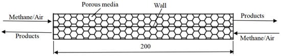 The RFB under study was used by Hoffmann and coworker [], and the burner has a length of 0.2 m and was packed with ceramic foams for different pore sizes. All the used ceramic foams have the same porosity (ε) of 0.875. The burner was thermally insulated by Kaowool-board having a thickness of 92 mm. Tokyo city gas 13 A (88% methane, 5.8% ethane, 4.5% propane, and 1.7% butane; low heating value, 46,000 kJ/m3) was used as fuel in the experiment []. For convenience, the mentioned gas was replaced with 100% methane. In this study, the LCL of an RFB with 13 ppi ceramics foam was numerically studied.