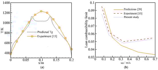 Predicted gas temperature and lean combustibility limit for the Reverse Flow Burner (β = 80 W/m3·K). (a) Predicted Tg for equivalence ratio of 0.1, mixture velocity of 0.083 m/s and experimental results; (b) Predicted lean combustibility limit as a function of mixture velocity [,].