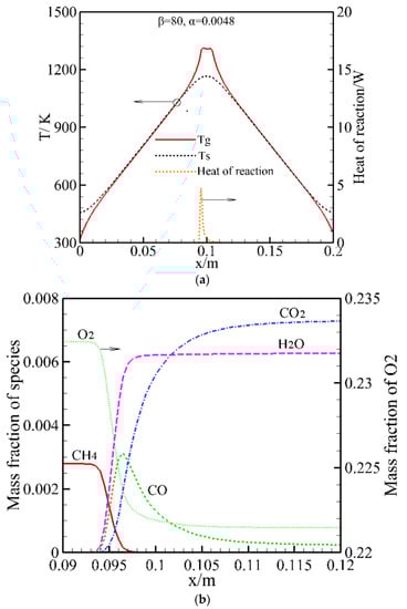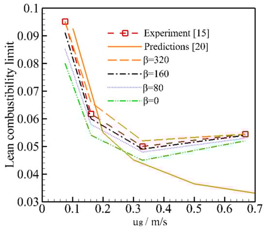 In this work, the LCL was determined by sequentially decreasing the equivalence ratio until flameout occurred. The steady state model was validated against an experiment [] and the predictions [] using a complete model with one-step kinetics, as shown in Figure 2b. A reasonable quantitative relationship between the simulations and the experiment can be observed, but our predictions are generally smaller than the results of the experiments. The predictions by Dobrego et al. [] show the same trend as the experiment when the mixture velocity is smaller. However, an opposite trend is predicted by the one-step kinetics as the mixture inlet velocity is greater than 0.3 m/s. One can see that improved predictions are obtained by this model compared to the one-step kinetics model. The predicted LCL in Figure 3 is obtained based on the suggested β = 80 W/m3·K. In the following we study the effect of β on the LCL.