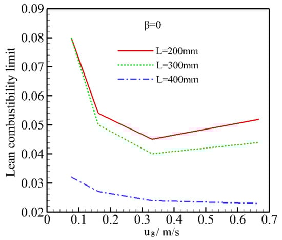 In the experimental study by Hoffmann et al. [], the LCL was finally extended from 0.028 to 0.026 for a natural gas/air mixture by increasing the burner length and cross section. In this work, the influence of burner lengths on LCL was evaluated; LCL curves as a function of mixture velocity for different burner lengths are shown in Figure 5. As shown in Figure 5, increasing the burner length extends the LCL. This is because more heat can be stored in the system as the burner length is increased for the same operating conditions. It is noted that a long packing bed leads to an increase in the pressure drop and a large apparatus. However, porous media having a high porosity (0.875) were used in this study; thus, the pressure loss through the burner can be ignored. The convective heat transfer coefficient between two phases, and the properties, porosity, and pore size of the porous media may have significant effects on the LCL. However, these effects are beyond the scope of this study and need further investigation.