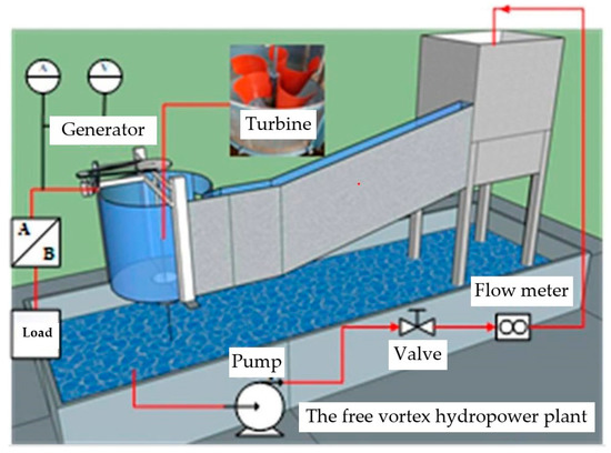 This research was performed by creating a free-flow vortex numerical simulation with a reservoir as a water source. The water inlet was designed to channel the water from a water tank and create a vortex force in the generator [21,22,23,24,25,26]. The cylinder-shaped turbine housing was 1 m in diameter and the height was 0.5 m, with a 0.2 m round-shaped drainage at the bottom. The water flowrate of the system, which ranged from 0.2 to 0.6 m3/s, was administered by an adjustable water pump (see Figure 2). The series of turbines of each type were hooked up to a transmission that linked to a power generator and a device that can read power output. The turbine testing procedures were performed as follows: