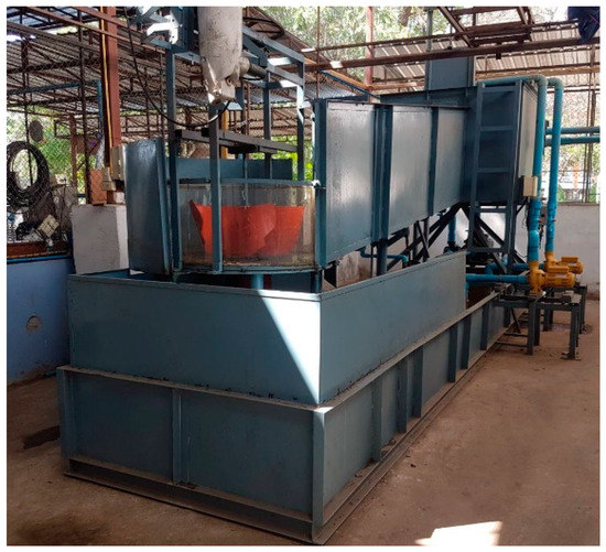Table 5 indicates that the 24-blade crossflow turbine with a 0.3 m height and 0.4 m diameter can achieve 21.91% efficiency at the 0.02 m3/s water flowrate. This can be attributed to the generator configuration. The turbine housing was laid vertically so the water flowrate was boosted by the Earth’s gravity. The design of the water flow activity within the system also increased the water flow speed, as the speed of water flowing through the drainage was faster than the speed of water flowing through the middle part of the generator. The turbine was mounted 0.02 m above the drainage to allow the turbine to obtain the full impact from the vortex. Moreover, the height of the turbine and vortex head were equal, allowing the vortex to cover all the blades’ surface (see Figure 8).