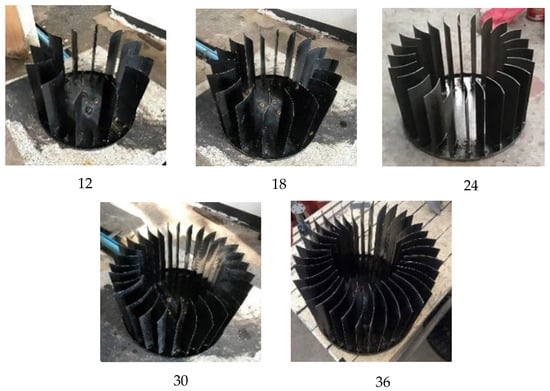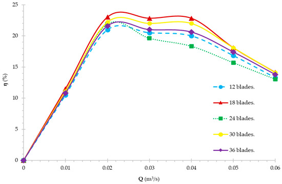 A series of five crossflow turbines with a 0.3 m height and 0.4 m diameter was tested with differing numbers of turbine blades (12, 18, 24, 30, and 36). They were all tested at water flowrates ranging from 0.02 to 0.06 m3/s. The result is shown in Figure 9.