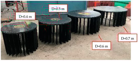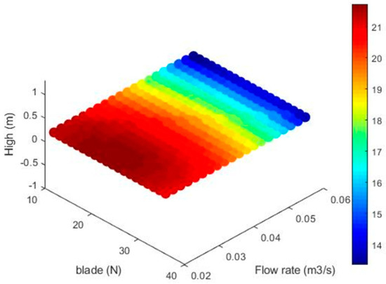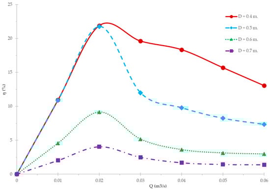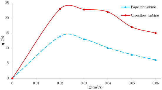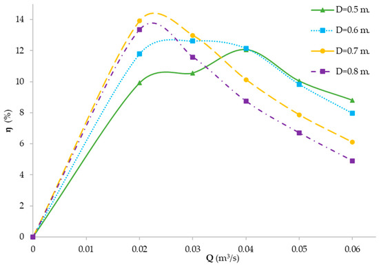 In total, four crossflow turbines with 24 blades and the same height (0.3 m) were tested at water flowrates ranging from 0.02 to 0.06 m3/s. Their diameters were 0.4, 0.5, 0.6, and 0.7 m, respectively, and the overall efficiency is shown in Table 5.