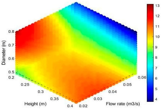 The data from Table 1, Table 2, Table 3 and Table 4 show that the propeller turbine with a 0.7 m diameter and 0.4 m height had 13.92% efficiency at a water flowrate of 0.2 m3/s. Increasing the turbine’s height and diameter between 0.5 and 0.7 m creates more blade surface area. With more blade surface area, the turbine can handle a greater force and flow speed of the vortex [21]. This increases the efficiency of the system. Although the propeller turbine with a 0.8 m diameter had the most blade surface area, there was an amount of resistant force from the housing wall against the turbine. This was due to the closer gap between the edge of the blade and the housing wall. Therefore, the propeller turbine with a 0.8 m diameter and 0.4 m height had less efficiency than the turbine with a 0.7 m diameter at the same height (see Figure 6).