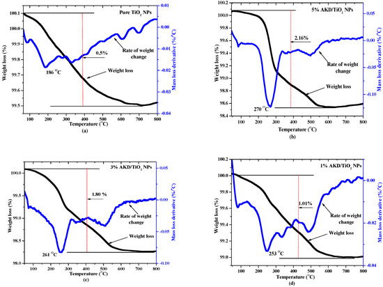 The Thermogravimetric analysis (TGA) of the samples was conducted under nitrogen gas. From the graph of pure TiO2 NPs (Figure 10a), a rapid loss of moisture occurred between 75 and 90 °C, followed by a significant degradation at about 186 °C which is attributed to the decomposition of the TiO2 [45,82]. The initial steep gradient (representing a rapid loss of moisture) and the subsequent steep depression on the graph further confirm the results obtained in Table 1 about moisture absorption of the unmodified sample. As for the 5% AKD-modified rutile-TiO2 NPs, there is drastic thermal decomposition at 270 °C which is about 45% higher than that of pure rutile-TiO2 NPs. For the reduced AKD content of 3%, the decomposition of modified rutile-TiO2 NPs occurs at a lower temperature of 261 °C which is about 40% higher than that of the pure rutile-TiO2 NPs. A further reduction of AKD to 1% resulted in the modified rutile-TiO2 NPs decomposing drastically at 253 °C which is about 36% higher than that of pure rutile-TiO2 NPs. For AKD, in all cases of surface medication of rutile-TiO2 NPs, there is increased thermal stability of at least 36%. In the case of ASA modified NPs, the temperatures at which the modified NPs drastically decomposed were 211 °C, 194 °C, 187 °C for 5%, 3% and 1% ASA content, respectively. It is worth noting that for all cases of ASA modification, the temperature at which drastic decomposition occurred was lower than the least % AKD content modified sample. This shows that AKD modified samples are more thermally stable than the ASA. However, the ASA-modified samples show improvement in thermal stability except for 1% content whose thermal stability is the same as that of the pure rutile-TiO2 NPs. Table 3 summarises the effects of surfactant content and type on the thermal stability of the resultant modified samples.