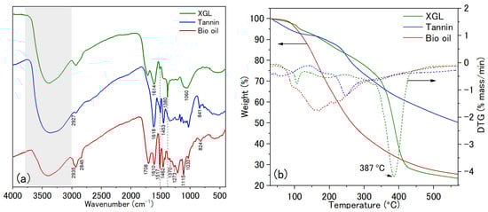 (a) FTIR spectra and (b) thermal analysis TG/DTG of bio-oil, tannin and XGL.