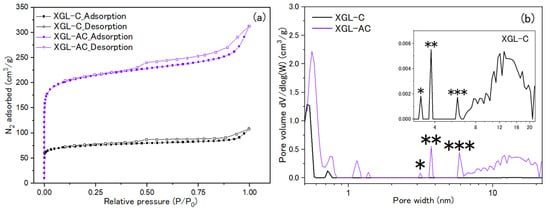 (a) Nitrogen adsorption isotherm of XGL-C and XGL-AC and (b) pore-size distribution calculated from DFT method. The asterisks are the matching peaks in the inset graph.