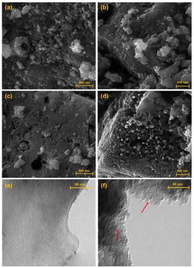 The SEM images in Figure 3 present the microscopic structure of the materials. The photos of XGL-C (Figure 3a,b) and XGL-AC (Figure 3c,d) show a rough surface matrix containing clusters of spherical particles of different sizes. Such agglomerated particles seem to be the typical structures of phenolic gels based on a nodular morphology, generally arranged in a microscale range and shifted to larger or smaller particles in function of the pH or mass ratio [19]. However, the microscopic structure of xerogel-like materials shown in Figure 3 is composed of nano-nodules particles. In addition, both samples presented an irregular porosity, but the activated material had a more distinct porous structure. These characteristics are observed on the TEM images as well (Figure 3e,f). The porosity is better evaluated on the AC sample, which shows areas with visible parallel channels (red arrows), usually classified as mesopores (pores between 2–50 nm) and found between graphite nanosheets on carbon materials. Furthermore, the activated xerogel-like presents an amorphous structure.