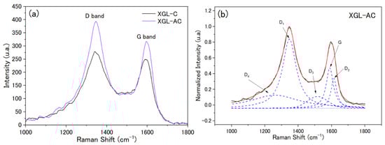 The structural details from the Raman spectroscopy and the respective deconvolution peaks with five bands for a satisfactory fit are presented in Figure 4a,b, respectively. The first-order parts of the Raman spectra showed two broad bands at 1580 cm−1 (G band) and 1320 cm−1 (D band), corresponding to the C-C bond vibrations of carbon atoms in an sp2 electronic configuration, and the defect and disorder of structures of carbon materials, respectively [46]. The intensity ratio of the D band to the G band (ID/IG) is a parameter that is often used to estimate the graphitization degree of carbonized materials. Thus, greater graphitization (lower ID/IG) is usually related to higher conductivity and crystallinity materials [47]. As already observed elsewhere [48], this represents the highest disorder structure. Furthermore, the intensity ratio of ID/IG for XGL-C and XGL-AC were 1.12 and 1.24, respectively, measured directly from the envelope of the spectrum and after baseline correction. These findings suggest that the XGL-AC presents a lower graphitic degree, lower conductivity, small ordered structure and higher oxygen functional groups than XGL-C, corroborated by their elemental composition, as observed in Table 3.