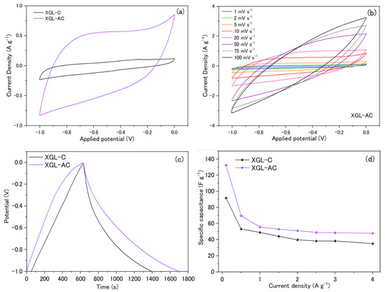 The electrochemical characterization was performed with an Autolab PGSTAT 302N. A conventional three-electrode electrochemical cell was prepared using a platinum plate as a counter electrode and Ag/AgCl saturated KCl as a reference electrode in an aqueous electrolyte KOH 6 mol/L. The Ag/AgCl saturated KCl electrode was always calibrated with a saturated calomel electrode, before and after all of the electrochemical characterizations [28,29]. The carbon electrodes were prepared by an ultrasonic suspension containing 15 mg of XGL-C or XGL-AC materials, Nafion 5 wt.% (50 µL), and ethylene glycol (100 µL). The suspension was deposited on a graphite plate and dried at 90 °C for two hours. Cyclic voltammetry (CV) tests were performed at scan rates between 1 and 200 mV/s within the potential range of -1 to 0 V. The voltage range used to test the cells corresponds to the maximum potential window used for aqueous electrolytes. Galvanostatic charge-discharge (GCD) experiments were carried out at constant density currents ranging from 0.05 to 20 A/g, based on the total mass of the electrode. The cycling stability was studied through GCD tests up to 1000 charge-discharge cycles at 1 A/g current density.