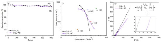The electrochemical impedance spectroscopy (EIS) (Figure 6c) presents the Nyquist plots of the electrodes. The high-frequency region (inset graph) usually describes the electrode-electrolyte interface resistance associated with the charge transfer and the double-layer [50]. The total equivalent circuit is described by the equivalent series resistances (Rs), the charge transfer resistance (Rct) and the constant phase angle element (CPE). The XGL-C electrode shows low contact and low equivalent series resistance (1.04 Ω) compared to XGL-AC (13.77 Ω), while the Rct values were very similar, 1.87 Ω to XGL-C and 1.96 Ω to XGL-AC, showing a slightly higher conductivity of the non-activated material. Hence, those specific capacitances of XGL-AC were slightly higher despite the enhanced surface area developed by the physical activation. Furthermore, both samples presented the 45° slope at a low frequency related to the resistance diffusion of ions on the interface/interior of the tiny pores, typical of porous carbon electrodes [51].