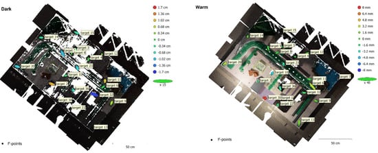 The results of this work can be the basis for planning the distribution of F-points when it is impossible to manipulate additional lighting (as in the case of studies conducted with the purpose of monitoring external artificial light at night—ALAN) or to select or change the artificial lighting of objects constituting the subject of the study. It must be noted that the quality of a photogrammetric study is affected by many factors, the specific division of which can be found in paper [23]. The most important factors include: object shape and colour [24,25], image quality [26], used software, methods [22,27], used sensors [28], accuracy of support systems [29,30,31,32] and data fusion methods [33,34,35], sensor orientation [1] or even the sensor’s temperature [36]. In this study, we focus only on the illumination of 3D urban mock-up lighting scene(s).