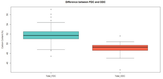 Boxplot displaying the differences between freeze-dried carbon (FDC) and oven-dried carbon (ODC).