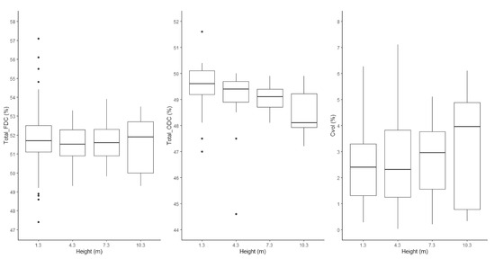Boxplot displaying the variation of freeze-dried carbon (FDC), oven-dried carbon (ODC), and volatile carbon (Cvol) with tree height.
