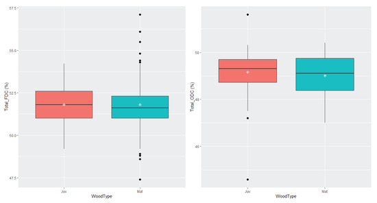 Boxplots displaying the differences between juvenile wood (Juv) and mature wood (Mat) for freeze-dried carbon (FDC), left panel, and oven-dried carbon (ODC), right panel.