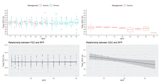 Boxplots displaying annual FDC distribution for spacing and thinning management data, annual ODC distribution for the spacing data, the relationship between FDC and RFP, and between ODC and RFP, all at breast height (1.3 m). FDC: freeze-dried carbon; ODC: oven-dried carbon; RFP: ring number from pith.