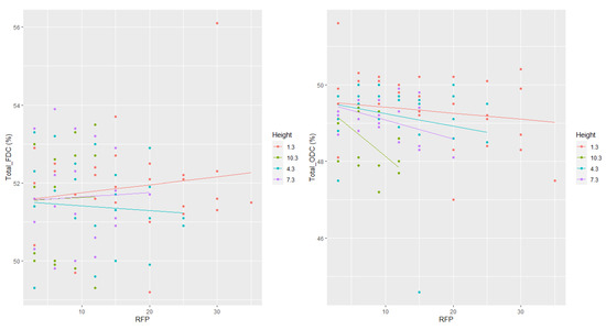 No statistically significant difference was found for the increasing FDC (thinning and spacing) across the various cambial ages at breast height (Figure 4). Although ODC significantly decreased with age (Figure 4, Table 2), this tendency was weak, with a coefficient of determination of 0.18. Except for height = 4.3 m, FDC increased with age (Figure 5) while ODC decreased with age at all considered heights (Figure 5). Although ODC decreased with height (Figure 5), this tendency was also weak (R2 = 0.18). There was no clear pattern of FDC variation with height.