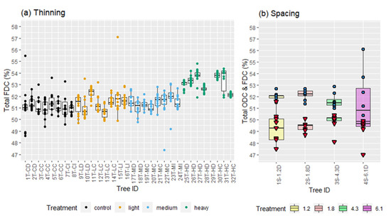 Inter-tree variation and treatment comparison at breast height (1.3 m) displaying (a) total FDC (thinning data) and (b) total ODC (red triangle) and FDC (blue circle) (spacing data).