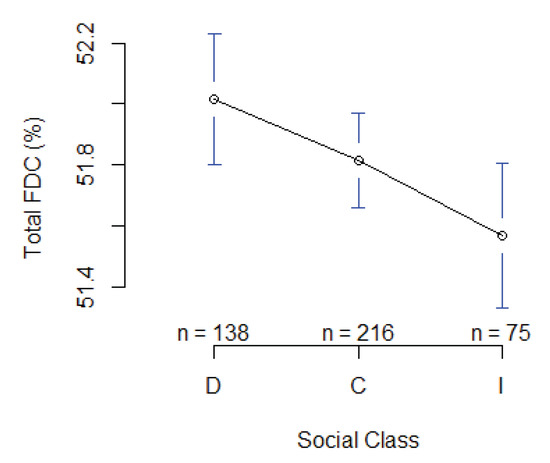 Mean plot displaying social class comparison for FDC at breast height (1.3 m) (D = dominant, C = co-dominant, I = intermediate).