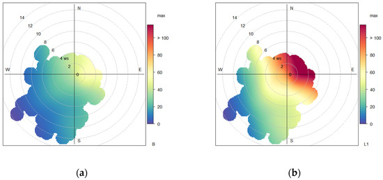In order to identify which conditions were conducive to the formation of pollution hotspots, the meteorological conditions under which high values of hourly average concentration of PM10 were recorded at individual locations were determined. For all locations, the maximum recorded PM10 concentrations show a significant dependence on wind direction. Figure 9 shows the polar plots for the maximum recorded hourly average concentration of PM10 depending on the wind direction and speed in the urban background and at individual locations.