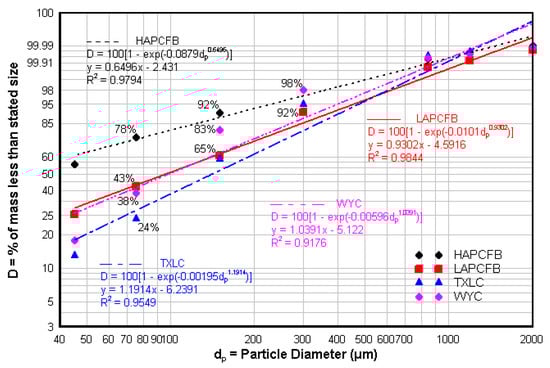 Particle size (Rosin Rammler) distributions of reburn fuels. Cumulative Mass %, D = 100 {1 − exp(−bdpn)}, See Chapter 4 of Ref. [], y = ln {−ln{1 − (D/100)}, x = ln(dp), y = nx+A, A = ln(b), Data fit for TXLC yields A= −6.2391, n = 1.1.1914. Similar procedure for HAPCFB, LAPCFB and WYC See Refs. [,] for size distribution for dairy biomass.