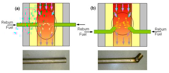 Schematic of the reburn fuel injection: (a) lateral (0°) injection and (b) 45° injection.