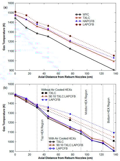 Temperature distributions of the flue gas along the axial distance from the reburn nozzle: (a) 45° upward counter-current reburn injection and (b) lateral (0°) reburn injection with and without HEXs.
