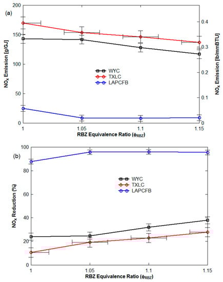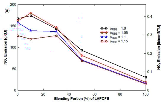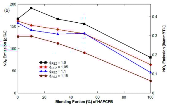 Figure 5 shows the results for NOx using pure fuels as reburn fuels while Figure 6 shows NOx results using blended fuels as reburn fuels. Figure 5a and Figure 6a show that the NOx emissions (g/GJ from Equation (5), and lb/MMBtu from Equation (8)) decreased with an increase of the ER of reburn zone. With increased ER, the oxygen in the combustion zone is depleted quickly. Low concentration of oxygen slows down the NOx formation and allows the NOx reduction to be dominant in the reburn zone.