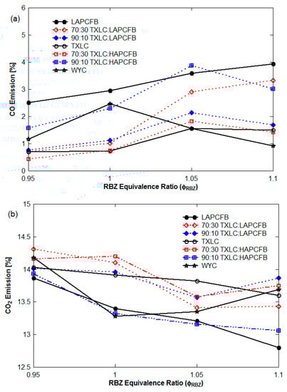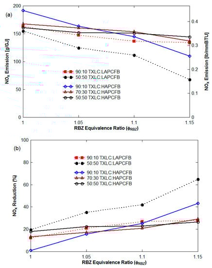 Figure 5b and Figure 6b show the NOx reduction (%) (=100 × {[NO] − [NO]initial}/[NO]initial). The range of the NOx reductions was found to be 88 to 96% for LAPCFB, 24 to 38% for WYC and 11 to 28% for TXLC. For the blended fuels, it was found to be 12 to 30% (90:10 TXLC:LAPCFB), 19 to 65% (50:50 TXLC:LAPCFB), 1 to 43% (90:10 TXLC:HAPCFB), 13 to 29% (70:30 TXLC:HAPCFB), and 18 to 26% (50:50 TXLC:HAPCFB). The pure HAPCFB was not attempted since the ash content was too high which leads to clogging of the burner. The results showed that LAPCFB is very effective in the reduction of NOx emission. NOx reduction increased with an increase of the LAPCFB proportion in the blends since more NH3 might have been available from LAPCFB. The volatile matter (VM) contributed almost 70% of heat for FB while VM in coals contribute only 40%.