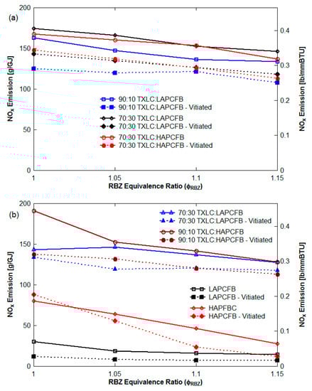 Since HHV per unit stoichiometric oxygen is roughly constant for most fuels, the higher heat contribution by VM in FB indicates higher consumption of oxygen, depleting the local O2 concentration. The reduced O2 aids in the reduction of NOx as validated by data from Tillman et. al. [] on co-firing of coal with low nitrogen agricultural biomass. Lawrence et al. indicated that the reduction in NOx reduction (measured trend line) was greater than expected values based on reduced fuel N of agricultural biomass [].