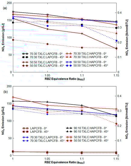NOx emission with blended reburn fuels without HEXs: (a) lateral (0°) reburn injection and (b) 45° reburn injection.