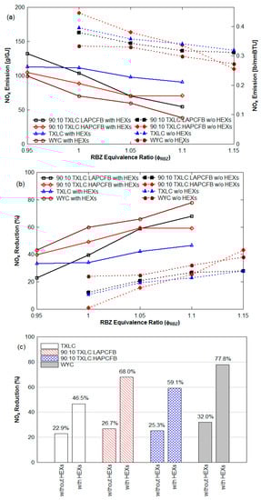 Comparison results of the cases with HEXs and without HEXs (non-vitiation and lateral (0°) reburn injection): (a) NOx emission in g/GJ, from Equation (5) and lb/MMBtu from Equation (8), (b) NOx reduction (%), and (c) result comparison at ERRBZ of 1.1.