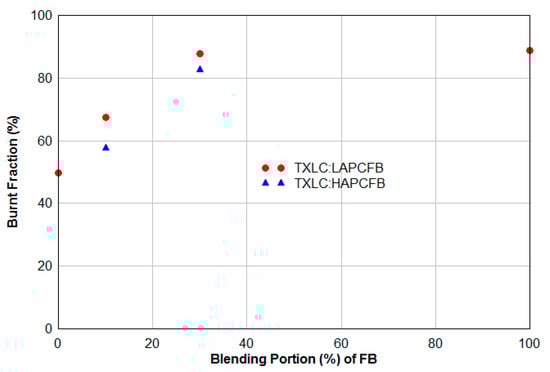 The burnt fraction is defined as the ratio of combustibles burnt to the initial combustible mass. Ash samples were collected from the surfaces of HEXs and from the ash port at the furnace bottom in the conditions of the non-vitiation and lateral (0°) reburn injection with HEXs. The results indicated that 100% burnt fraction were detected for the samples from all HEX surfaces since the fuel particles on the surface kept burning during the combustion. The burnt fraction obtained from the bottom ash (Equation (12)), shown in Figure 11, is somewhat low due to that the bottom ash is mostly the heavy ash. The lighter fly ash in the gas stream flowed into the exhaust duct, and only heavy solid particles dropped into the water in the ash port. It was found that the burnt fraction increased with the increase of the proportion of FB in reburn fuels, and the LAPCFB showed the highest burnt fraction. This is because FB has a large amount of the volatile matter (almost 80% on a DAF basis) and also its particle sizes are smaller compared to TXLC. For the accurate burnt fraction estimation, both lighter fly ash and heavier bottom ash should be analyzed together.