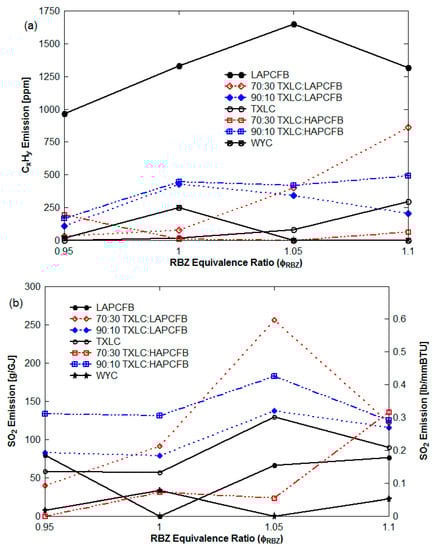 The effect of the gas temperatures and deposited solids on tubes can be the reasons for these results. Further soot may be deposited on HEXs and NOx is known to react with C (or soot), producing CO and H2. Another cause may be the catalytic effect of the deposition of fly ash on HEXs. The fly ash in power plants can be used as a catalyst in selective catalytic reduction (SCR) systems for NOx and SOx reductions since it contains high silica and alumina contents []. During reburning, the injection of metal-containing compounds (Fe-, Na-, K-, and Ca-) with the primary fuel was effective on NOx reduction, and the use of fly ash including metallic oxides (Fe2O3, Na2O, K2O, and CaO) were also somewhat effective on NOx reduction []. In the current study, the catalytic effect of the fly ash produced from FB combustion was stronger than that of the fly ash produced from TXLC combustion. Figure 10c shows a comparison of results with and without HEXs at ER of 1.1. A 24% NOx reduction was increased for TXLC in the presence of HEXs, while increase in NOx reduction were about 41% for 90:10 TXLC:LAPCFB, 34% for 90:10 TXLC:HAPCFB, and 46% for WYC. The burnt fractions of the blended fuels computed from Equation (12) were higher than the burnt fraction of TXLC (see Section 3.6), and hence the amounts of ash produced from the blended fuels were higher, indicating more metallic oxides were available during the combustion period. In addition, a layer of ash depositions was formed on the surface of the HEX. The fuel particles on the surface kept burning during the combustion and finally became pure ash, thus even more metallic oxides in the ash were available for the cases in the presence of HEXs.
