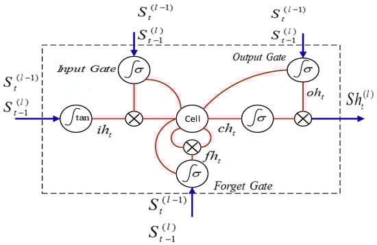 In this section, LSTM networks are introduced first, and then BLSTM networks are described. Against standard feedforward neural networks, RNNs, which benefit from recurrent weights, can learn the temporal dependence among data. This property of RNNs has a significant effect on the accuracy of time series forecasting results []. The main challenges in the training of deep RNNs are vanishing and exploding gradients. To solve these problems, the robust version of RNNs known as LSTM networks have been introduced in []. The construction of an LSTM block is shown in Figure 1. Equations (9)–(13) describe the general formulation of an LSTM block [,]. In Equations (9), (10) and (12), the amount of outputs for input (it), forget (ft), and output (ot) gates are calculated, respectively. In addition, Equation (11) shows the cell state, and St is the output of LSTM block.: