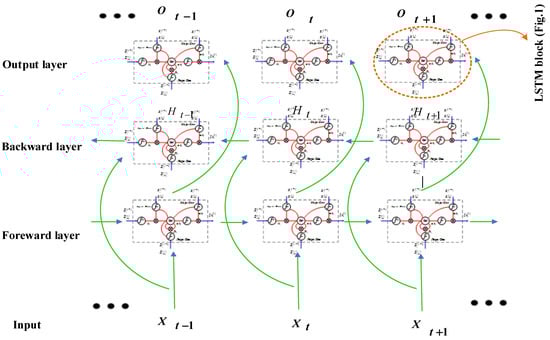 Figure 2 presents the structure of the BLSTM networks which models the long-term dependencies. The accuracy of time series forecasting results can be improved by considering the whole temporal horizon with two-directional memory of the BLSTM networks [,].