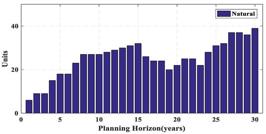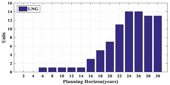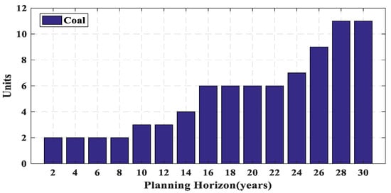 Figure 3, Figure 4, Figure 5, Figure 6 and Figure 7 show the number of different power plants of the test system in a 30-year horizon. It can be seen that due to retirement, some power plants are out of plan in some years, but it is not efficient to rebuild these power plants and the remaining demand is supplied by constructing other power plants type. Figure 3 shows that the LNG power plants have been used at the end of the planning period more. Due to lower operating cost of coal power plants than the LNG type, these power plants have been used more throughout the period as shown in Figure 4. In Figure 5, two oil-fired power plants constructed in the 4th year are retired in the 22nd year. In this year, instead of constructing new oil-fired power plant, four new LNG power plants are built to provide load and supply balance. As shown in Figure 6 and Figure 7, due to the high investment cost and low operating cost of nuclear power plants, they have been used at the beginning of the period. Without considering the lifetime, it is necessary to rebuild the power plant(s) of the same type after retirement. Then, the GEP problem solving without considering the lifetime has more limitations. Therefore, the optimal result of the GEP problem considering the lifetime is always equal to or less than the optimal result of the same problem without considering lifetime.