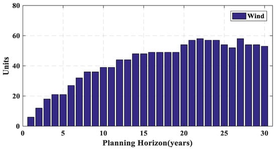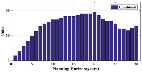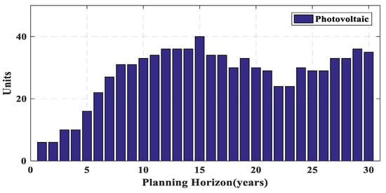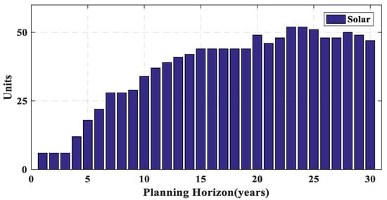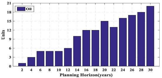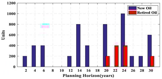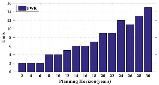 Table 6 presents retired and new power plants of the test system in a 30-year horizon. It can be observed that the power plants are out of the plan when their lifetime spans. For instance, since oil-fired power plants lifetime is 20 years, two oil-fired power plants constructed in the 4th year are retired in the 22nd year. The red (blue) numbers indicate the conditions that the number of power plants constructed from a type is greater (less) than the number of retired power plants of the same type. According to Table 6, in the 26th year, two PWR power plants are retired and a new PWR power plant is rebuilt. Therefore, the total number of PWR power plants is decreased. This result is indicated in the 26th year of Figure 7, where the trend curve is decreasing. If the lifetime constraint is not considered, the total number of power plants is always increasing.