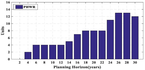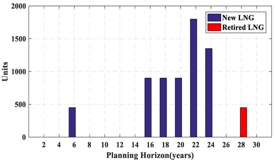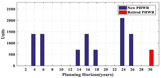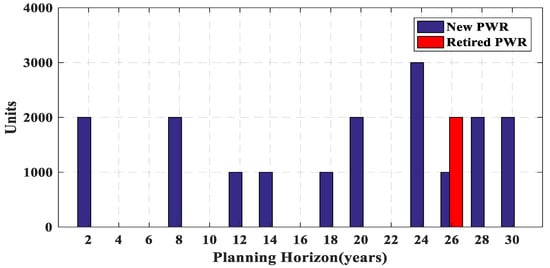 The total operation cost is obtained by the summation of all the years operation cost. The cost of the construction is only calculated in the year of power plant installation. Figure 8, Figure 9, Figure 10, Figure 11 and Figure 12 present a new and retired power plant capacity of each year. It can be observed that although PHWR and PWR power plants have high construction cost (Table 4), the low cost of the operation causes that a large share of the production is provided by PHWR and PWR plants in the early years of planning. On the contrary, according to Table 4, the least construction and the most operation cost belong to LNG power plants. Therefore, due to high operation cost, only one LNG power plant is constructed before the 16th year as shown in Figure 8.