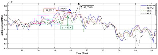 To show the robustness of the BLSTM network, three error criteria of the forecasted results are calculated for different methods which are presented in Table 8. These error criteria are the mean absolute error (MAE), the mean absolute percentage error (MAPE), and the root mean square error (RMSE) []. As presented in Table 8 and Figure 13, the BLSTM method has a better performance compared to the other benchmark methods in forecasting the daily peak load. In addition, the annual forecasted peak load by the BLSTM for the year 2020 is 59,258.2 MW which only has a 1.22% error in comparison with the real data, whereas LSTM has a 3.59% error, and MLP has a 5.07% error, which shows the superiority of the BLSTM method in annual peak load forecasting. The forecasted annual peak loads for 30 years (2020–2050) are presented in Table 9.