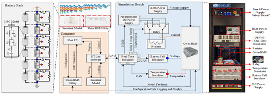 To analyze the performance of battery pack topologies on the balancing operation, an OPAL-RT bench equipped with a battery cell simulator, a temperature simulator, a programmable single-quadrant DC power supply (in a current control mode), and an OP5700 real-time simulator is used in conjunction with the Orion BMS to form a CHIL testbed. This testbed allows charging and discharging operations by means of an automated relay controlled by the Matlab/Simulink model, which switches the current flow from the programmable DC power supply across the resistor in the event of a negative current in the simulation. This in effect, is read as a charging/discharging current by the Orion BMS’s DHAB S/125 open-loop hall effect current sensor, which is placed between the relay and the resistor. The relay is operated using a DB-37 digital output port and a 12V DC supply voltage from the real-time simulator. Communication between other simulation peripherals is facilitated by two common communication protocols, TCP/IP and controller area network (CAN). The CAN bus network interfaces using PCIe slots that are also located on the real-time simulator. The Orion BMS is powered by a separate, additional power supply providing a 16 V output. Orion connects with a battery cell simulator using six voltage probes and six negative temperature coefficient thermistors to read individual battery voltages and temperatures. The precision of temperature measurements obtained from the Orion BMS has an integer step of 1 °C. The Orion BMS allows for the configuration of a target V, where V is the allowable difference between maximum and minimum voltages of individual batteries in a battery pack topology. The CHIL testbed used for validation of the Orion BMS can be visualized in Figure 1 including an overview of the communication pathways, feedback loops, supply currents/voltages, and measurement locations for Orion BMS sensors.