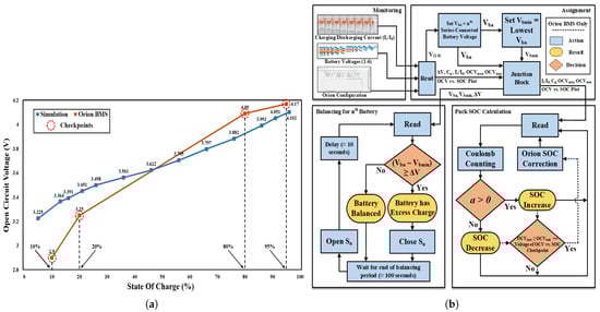 (a) SOC vs. OCV plot for simulation and Orion BMS, (b) Simulation and Orion BMS Operational Flowchart.