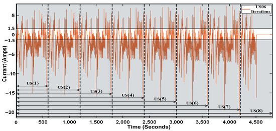 Assessments have been conducted in order to analyze the second life battery balancing capabilities of the Orion BMS and include subjection to a rigorous charge-drive cycle. A US06 current profile, shown in Figure 4, where each {US(N + 1) − US(N)} portion with a duration of approximately 10 min, has been selected for the drive portions of the sequence, and a CC of 1.375 A and 0.6875 A (through each individual battery) is selected for the charge portions of the sequence based on the datasheet, for 6s1p and 6s2p topologies respectively. Battery sequencing is realized by alternating drive and charge portions where drive time and charge time are incremented by one US06 iteration and 7.5 min, respectively, until a cumulative maximum drive duration of 80 min and a cumulative maximum charge duration of 60 min has been achieved. To properly sequence the 6s1p topology, the US06(1) drive portion is omitted. For the 6s2p topology, the US06(1) drive portion is placed at the end of the sequence in order to keep continuity, and an additional alternating sequence is also used because of the increased capacity. Although the US06 current profile has a maximum charge (regenerative) and discharge currents of 7.57 A and −20.82 A, respectively, the drive current is limited to ±1.5 A within the simulation model. This limit is obtained from the datasheet of the programmable DC power supply. A V target of 50 mV is set in the Orion BMS utility as the voltage threshold at which balancing is triggered for any individual battery outside of this limit in comparison to the lowest series-connected individual battery voltage. A breakdown of the battery pack topologies, charge-drive sequences, V targets, and current limits being used during each test can be found in Table 2.