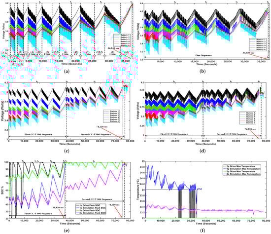 The alternating charge-drive sequence used for both battery pack topologies can be visualized in Figure 5a and is subsequently shown in its entirety in Figure 5a–f. Individual battery voltages of the first topology, for both the simulation and the Orion BMS, can be seen converging in Figure 5a,b respectively. Similarly, individual battery voltages of the second topology, for both the simulation and the Orion BMS, are shown in Figure 5c,d, respectively. Balancing time for the 6s1p topology is shown in Figure 5a,b,e, as a dotted line at 36,830 s. Similarly for the 6s2p topology, a balancing time of 74,220 s is shown in Figure 5c–e. Total battery pack SOC from both the simulation and the Orion BMS for both 6s1p and 6s2p topologies can be seen together in Figure 5e. Maximum measured battery pack temperatures from both the simulation and the Orion BMS for both topologies can be seen in Figure 5f. Temperatures for the 6s2p topology are considerably lower considering that the current flow through each individual battery is half (0.6875 A) compared to the 6s1p topology (1.375 A). It should also be noted that maximum temperatures stabilized with a decrease in SOC imbalances, for both topologies.