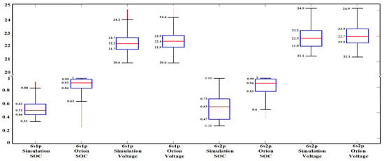 As shown in Figure 6 for both topologies, the interquartile range decreases in comparison with simulation, meaning that data from the Orion BMS is less dispersed. While Orion BMS’s voltage distribution presents close to a normal distribution, its SOC distribution shows right skewness resulting from the SOC frequently reaching the maximum value as evident in Figure 5e. In addition, a significant reduction in the density and quantity of outliers from 6s1p to 6s2p suggest that the unusual or error introducing data points reduce as the topology gets scaled up.