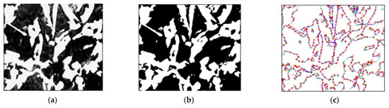 The result of the preliminary processing of the image of the metal microstructure: (a) grayscale microstructure image; (b) binarization of the metal microstructure image; (c) image thinning operation and boundary detection with Prewitt’s filter.