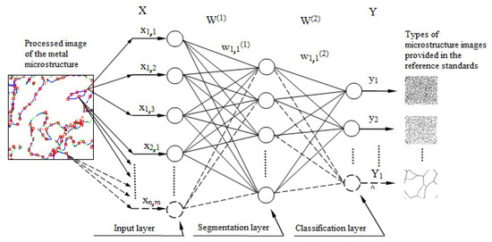 Subsequently, neural network processing of the received input values is performed with segmentation of the image of the metal microstructure in the hidden layer of the neural network to determine and classify the characteristics of the metal. To process the received input values, one can use multilayer neural networks (perceptron and RBF networks), which have an input layer, a hidden layer, and an output layer of neurons. The number of neurons in the input layer is calculated by multiplying by three the number of base points in the sample of metal images (since 1 base point is characterized by three parameters: sin, cos, Gp—brightness). The size of the hidden layer of the neural network is calculated by dividing the number of neurons in the input layer by three, since, in the hidden layer, the image of the metal microstructure is segmented based on the base points of the image segments. The size of the output layer is determined by the number of metal grades to be recognized.